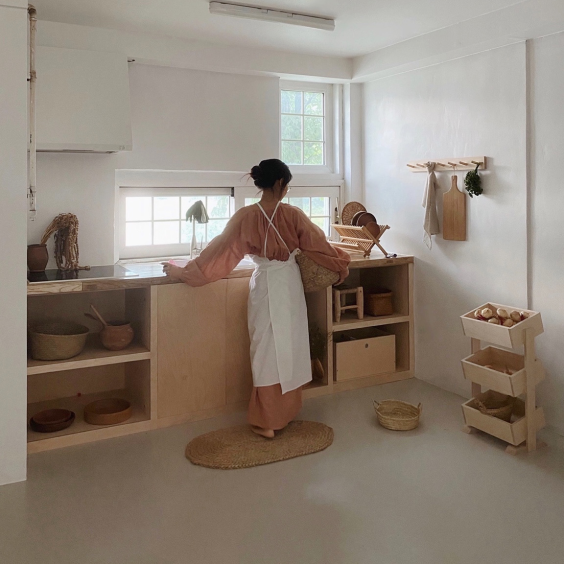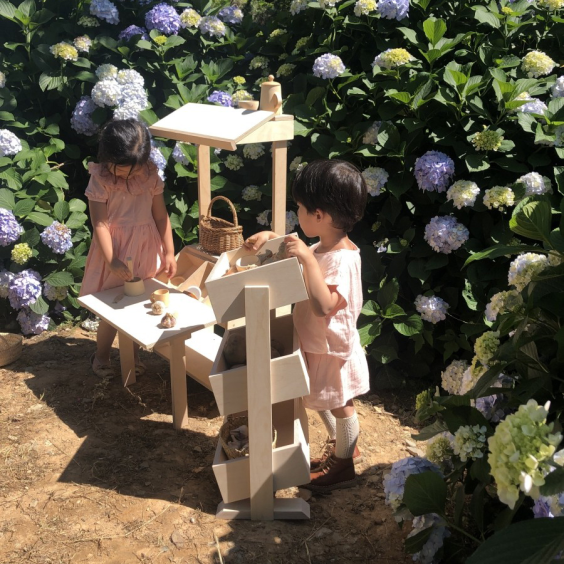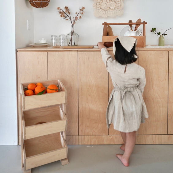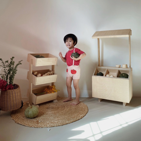 The three-tier basket is a product that can be placed next to kitchen play or market play and used with toys inside.