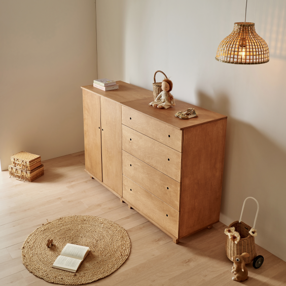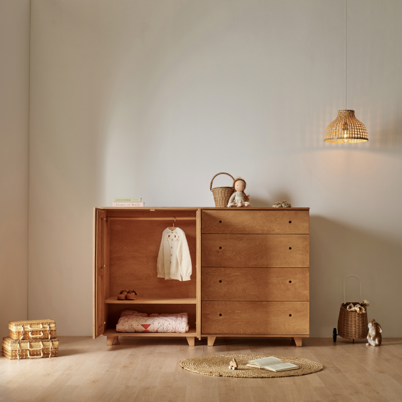 옷 말고도 장난감이나 책을 보관하셔도 되고, 폭이 깊어서 베딩 제품들을 보관해도 좋아요. 옷장 위에는 인형의 집이나 소품들을 올려두어 다양하게 연출할 수 있어 실용적이에요.