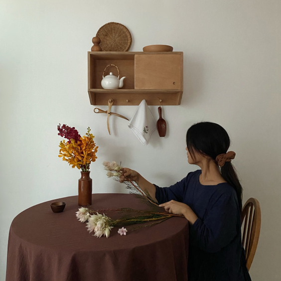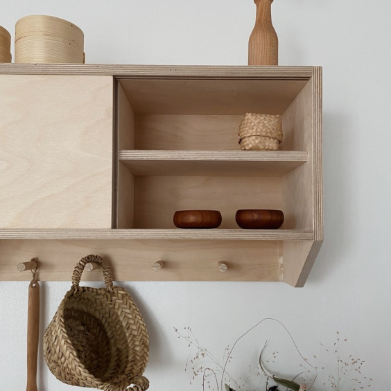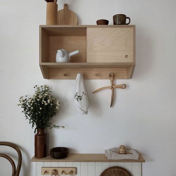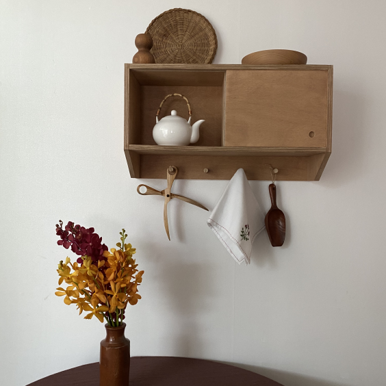 미닫이장은 부엌이나 방 한 켠에 걸어두면 아주 멋져요. 오른쪽엔 2칸의 수납공간이 있고, 하단에는 4개의 후크가 있어서 수납하기 편리하며 그릇장이나 찻잔장으로 사용하셔도 좋아요.